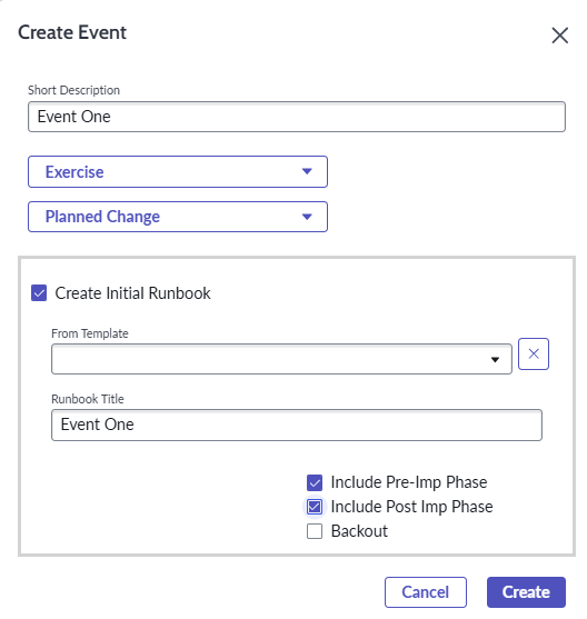 - You also have the option to flag this as an Exercise or an Actual Event. Selecting either of these options will not make any difference to how the Event will execute, but merely flag whether it is a walkthrough/rehearsal or a live cutover.