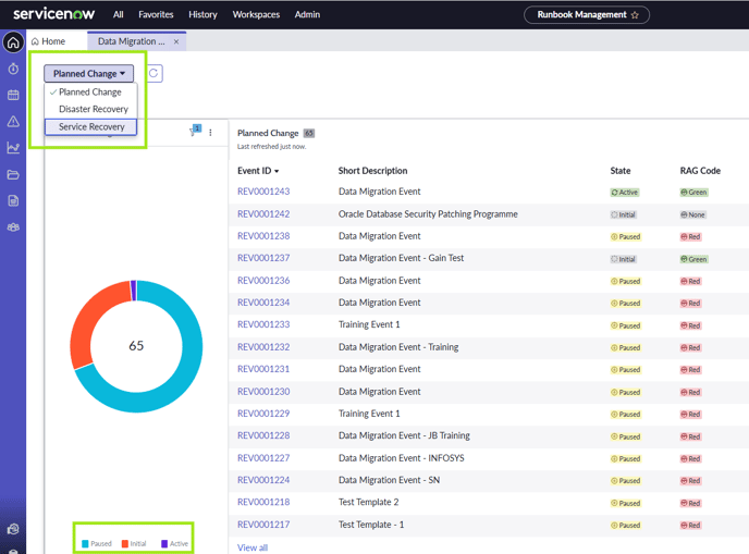The data can be filtered between Planned Change, Disaster Recovery and Service Recovery categories, using the drop down at the top left of the page.