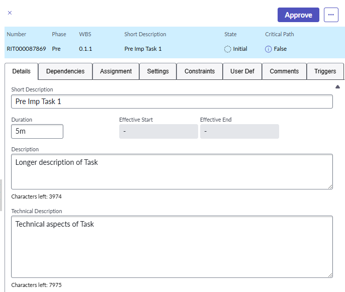 - Details: allows you to change the task title, the task duration, or add a longer description or some technical details