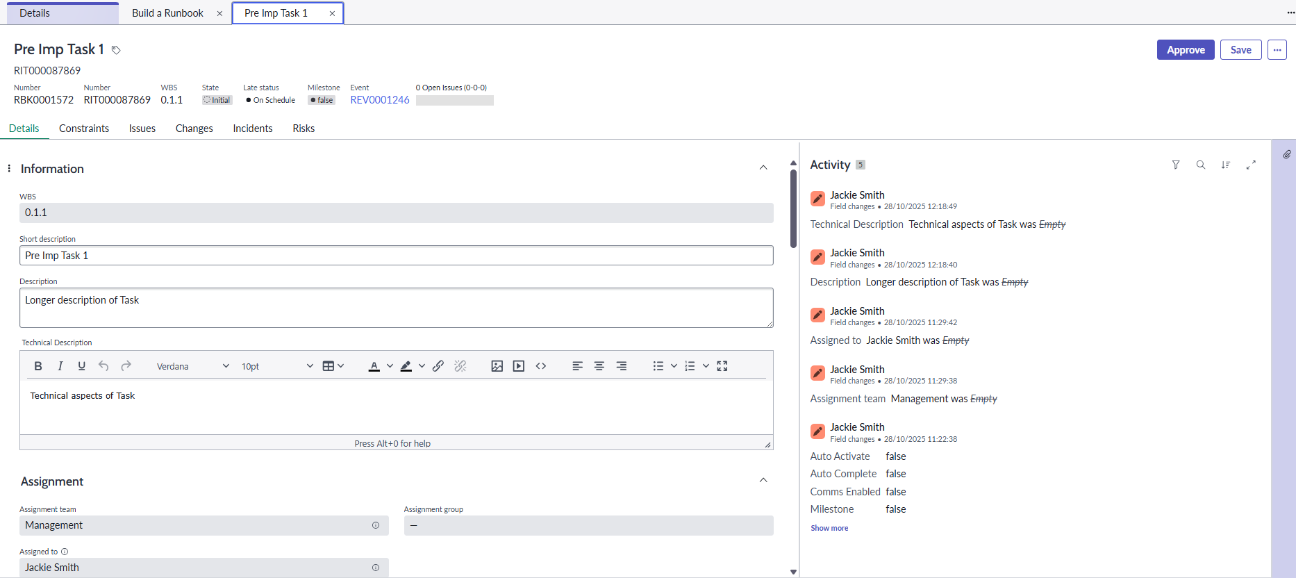 Once you have added a task to a Runbook from the Planner screen, you can go to the task detail and make further edits: